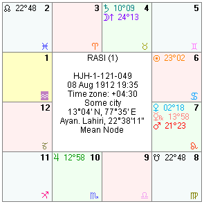 The total is 13. Divide this by 12 and the balance is 1. One counted from Taurus (where the radical Moon is situated) gives Taurus as the special Dhana Lagna.