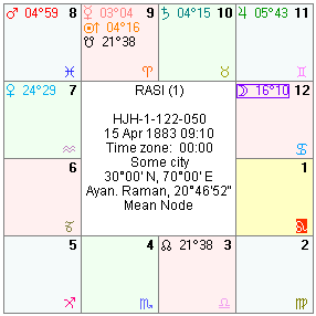 In chart #50 the lord of the 9th from Lagna is Mars. His Kala or root number is 6 Lord of the 9th from the Moon is Jupiter and his root number is 10. Total is ]6. Dividing by 12 we get as remainder 4 which counted from Cancer (where the Moon is) gives Libra as special Dhana Lagna. Unfortunately, Rahu is there aspected by the Sun, Mercury and Ketu. Mercury is combust and has lost his vitality. Ketu's situation has rendered these planets powerless. The presence of an incendiary planet in special Dhana Lagna is not desirable. This horoscope belongs to a gentleman, once an aristocrat, but now reduced to poverty, debts and mental torture.